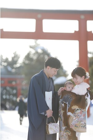 神社境内で澄んだ空気の中、赤ちゃんの健やかな成長を祝う、和装のご家族。日本の古き良き伝統がつまった、素敵なお祝いですね。赤ちゃんと共にパパとして、ママとして、成長していくための第一歩となる素敵なお祝い行事に日本の伝統衣装をお揃いで纏うことで、きっと家族の絆も深まります。