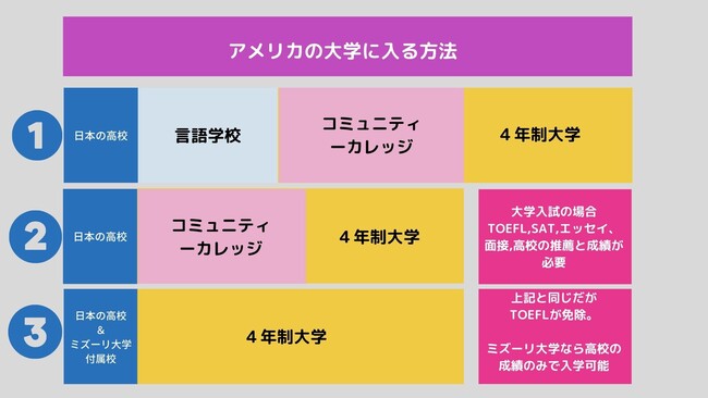 3.TOEFL免除で、4年制大学に直接入る方法。特にミズーリ州立大学に入学する場合は、成績のみで入学可能。