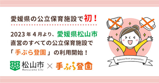 BABY JOB株式会社(本社:大阪府大阪市、代表取締役社長 上野公嗣)は、2023年4月より愛媛県松山市直営の公立保育施設全園において、保育施設向け紙おむつのサブスク「手ぶら登園」が利用されることをお知らせします。愛媛県内の公立保育施設では、初の取り組みになります。