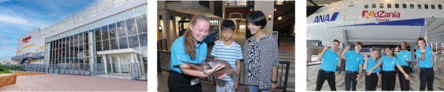 左から:キッザニア福岡(外観)/ワークショップの様子(イメージ)/外国人スタッフ(イメージ)