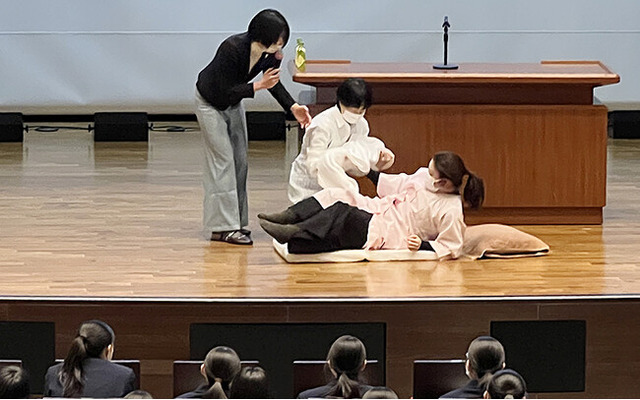 助産師の仕事をわかりやすく伝えるために,臨床での仕事のメインの部分の「お産の現場」を再現劇で紹介しました。