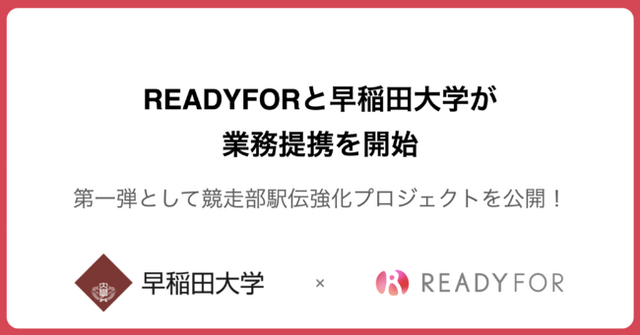 日本初・国内最大級のクラウドファンディングサービス「READYFOR」を運営するREADYFOR株式会社(本社:東京都千代田区、 代表:米良はるか)と早稲田大学(所在地:東京都新宿区、総長:田中愛治)は業務提携を締結し、本日、提携後第一号としてクラウドファンディングプロジェクト「箱根の頂点へ。そして世界へ。早稲田大学競走部駅伝強化プロジェクト」を開始いたしました。