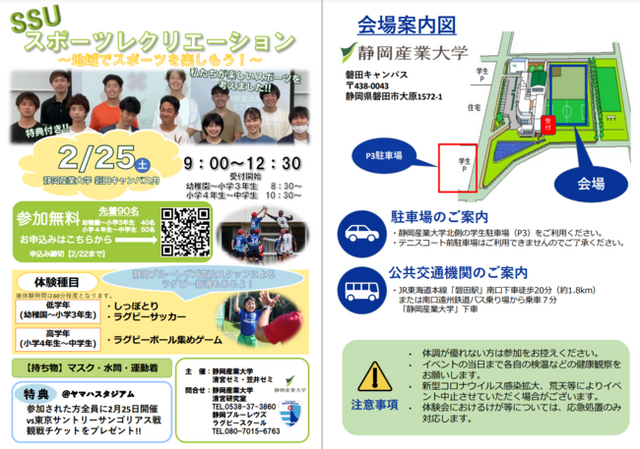 静岡産業大学の学生の皆さんが企画・運営を行い、静岡ブルーレヴズ育成普及担当のスタッフがラグビーのコーチを務めるコラボレーション企画となります。