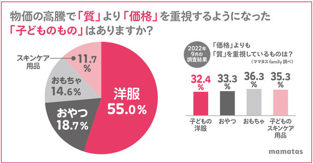 「子どもの洋服」「おやつ」「おもちゃ」「子どものスキンケア用品」は、物価高騰前には「価格」より「質」で選ぶ割合がそれぞれ35%前後と高い傾向にありましたが、物価高騰後には55.0%の人が「子どもの洋服」は価格重視に切り替える結果となりました。