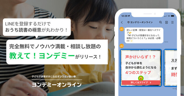 また、ヨンデミーオンライン公式LINEアカウント上にて提供しており、友だち追加後は相談受付に加え、家庭で気軽に実践できる読書教育のノウハウやコツを発信いたします。