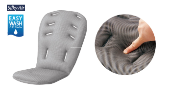 エアーシートの中の素材は縦方向の繊維で空気の通りを妨げない「シルキーエアー」。洗濯機で丸洗いできます(※) 。クッション性のあるシートが1枚上にあることで、さらにふかふか快適な乗りごこちに。
