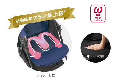 新衝撃吸収材搭載で、赤ちゃんの頭部に伝わる衝撃を約半分に軽減(※) 。また、ほど良い高さで赤ちゃんの首を無理なく支え、独自の形状が振動による頭の揺れを抑えます。