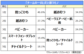ママ1位は「抱っこひも」、「家事をしたり出かけたりする上で必要不可欠な存在」「1日で一番使うから」などの声が寄せられました。