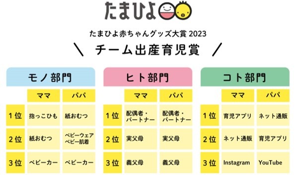 新型コロナウイルス感染症の拡大を受け、「たまひよ」は妊娠・出産・育児をチームでサポートしていく社会がますます必要と考え、昨年より子育てにあたって力になってくれる、頼りになるモノ・ヒト・コトを選ぶ「チーム出産育児賞」を新設。今年はママ・パパ別にランキングを発表いたします。