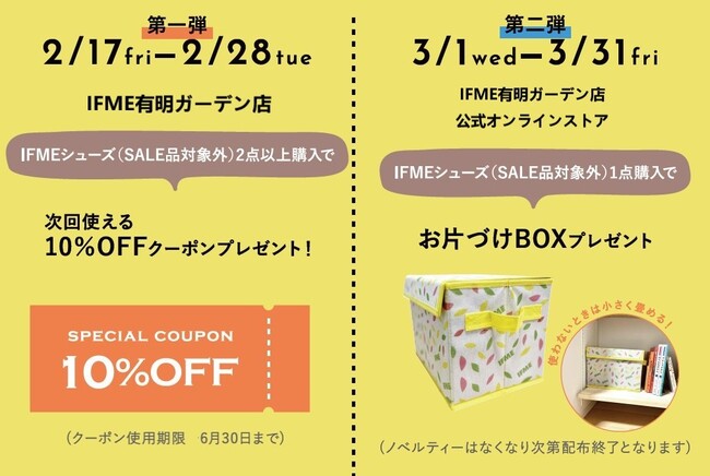 第2弾は、3月1日(水)から「イフミー有明ガーデン店」「イフミー公式オンラインストア」にてシューズをお買い上げのお客様に、オリジナルの『お片づけBOX』をプレゼントいたします。第2弾もオンラインストアでは送料無料でお届けする、お得なキャンペーンです。