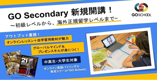 この度、「地球を舞台に活躍できる“バイリンガル国際人”」を目指すことをミッションとして、初心者レベルから海外正規留学レベルまで幅広い英語力に対応した、中高生・大学生向けのコース「Go Secondary(ゴー・セカンダリー)」を新たに開講いたします。