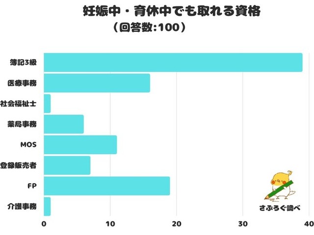 妊娠中・育休中でも取れる資格をアンケートにて調査したところ、1位は「簿記3級」でした。