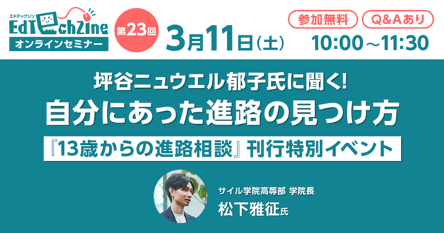 本セミナーでは、「13歳からの進路選び」をテーマに、通信制オンラインスクール「サイル学院高等部」学院長の松下雅征氏に登壇いただきます。さらに、国際バカロレアの普及に取り組み、日本の教育の国際化に多大な貢献をされた坪谷ニュウエル郁子氏をゲストにお招きし、これからの進路選びについて対談形式でお話しいただきます。