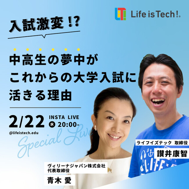 中学生・高校生向けのプログラミング教育サービス事業を手がけるライフイズテック株式会社(本社:東京都港区、代表取締役 CEO:水野 雄介)は、2月22日(水)にヴィリーナジャパン株式会社代表取締役で4人のお子様を育てる青木愛さんとのオンライントーク『「中高生の夢中」がこれからの大学入試に活きる理由』をインスタグラムライブにて開催します。