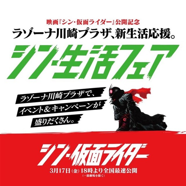 三井不動産商業マネジメント株式会社(所在:東京都中央区、代表取締役社長 大林修)が運営する三井ショッピングパーク ラゾーナ川崎プラザでは、2023年2月23日(木・祝)~3月31日(金)の期間に映画『シン・仮面ライダー』(2023年3月17日(金)18時より全国最速公開 (一部劇場を除く)同年3月18日(土)全国公開)とタイアップをした「シン・生活フェア」を開催いたします。新生活をテーマとした「春のおすすめ新生活グッズ」新しい自分にチャレンジする「変身ファッション、コスメ、雑貨アイテム」新入生や新社会人に向けた「フレッシャーズアイテム」をご紹介いたします。また、対象店舗で商品を購入するとオリジナルステッカーが当たるプレゼントキャンペーンや、ARを活用した『シン・仮面ライダー』フォトスポットなど、様々な取り組みを開催いたします。