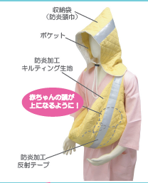 赤ちゃん用スリングの専用収納袋がお母さんの防災頭巾になっている、母と子一体型の避難具。スリングタイプは両手が完全に自由に使えるので、より安全に避難することが可能。生地には(財)日本防炎協会の防炎性能試験に合格した防炎キルティング素材を使用し、視認性を高める防炎反射テープ付き。専用収納袋の内側にはおむつを収納できるポケットがあり、スリングを使用して避難先でのおむつ交換もでき、洗濯も可能。
