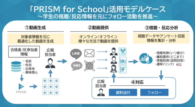 一人ひとりに最適化した動画(パーソナライズド動画)を自動生成可能なDXテクノロジー「PRISM(プリズム)」を通じてOne to Oneマーケティングを推進する株式会社クリエ・ジャパン (本社:東京都渋谷区、代表取締役社長:中沢 宏、以下クリエ)は、大学や専門学校などの学校法人向けに合格者の入学歩留まり向上や、オープンキャンパス参加者のフォローを個人に最適化した動画を通じて情報提供と分析を可能にする『PRISM for school』の提供を開始しました。