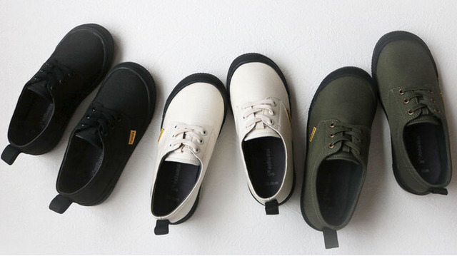 「長靴は履きたくないけど濡れたくない」というキッズにぴったりなレインスニーカーは、光沢を抑えたポリエステルキャンバス生地を使い、ベーシックなデザインとカラー展開で普段のコーディネートにも取り入れやすくなっています。