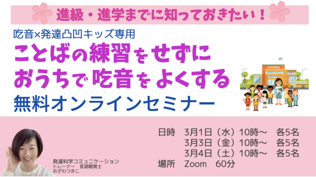 この度は、「\進級・進学までに知っておきたい!/吃音×発達凸凹キッズ専用 ことばの練習をせずにおうちで吃音をよくする無料オンラインセミナー 」を開催します。