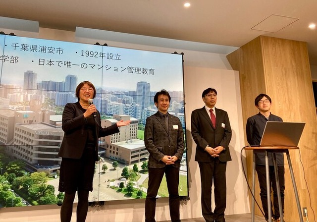 当社が所有する実際のマンションデータに基づいた条件設定のもと、「築30年のマンションの管理改善計画」をテーマとした演習プログラムを、明海大学の小杉学准教授・藤木亮介准教授らと共同で企画。全16回行われた授業の最終回では、総会の場で区分所有者に対し管理改善計画の提案を行うことを想定したプレゼンテーション発表会を、当社の情報発信プラットフォーム「赤坂プラスタ」で行いました。マンションみらい価値研究所所長 久保依子をはじめ、同研究所のメンバー、そして当社役員などが直接フィードバックを行い、マンション管理業界のリアルな課題感を学生に伝えることができました。