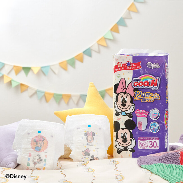 パッケージとおむつ柄には、“ミッキーマウス”と“ミニーマウス”が描かれた人気のディズニーデザインを採用。1パックに2種(昼と夜のデザイン)のおむつ柄が入っており、昼と夜で気分を変えながらおむつ替えをお楽しみいただけます。