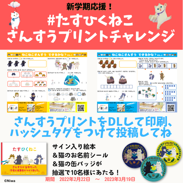 マイクロマガジン社(東京都中央区)は、新学期応援オリジナルグッズが当たる!絵本『たすひくねこ』さんすうプリントチャレンジを開催いたします。