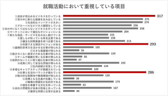 今回は新たに、上記25項目のうち「回答者が就職活動において重視している項目5つ」の問いも加え、現在就職活動中の学生が企業を選択する上で重要だと思う要素を調査しました。