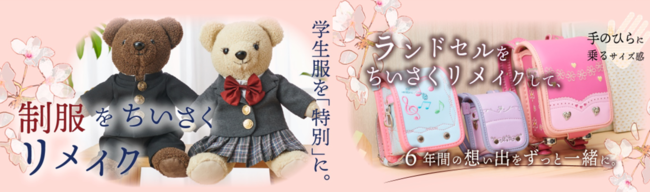 大切な学生生活をともに過ごした学生服のリメイクサービスにミニチュアサイズほか、新たに「ぬいぐるみサイズ」を加えてマジックミシン全店で展開拡大します。お持ちのぬいぐるみに想い出の制服を着せていただくことでずっと一緒の「特別」に変わるリメイクサービスです。