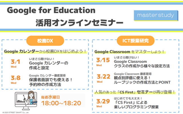 株式会社ストリートスマート(所在地:大阪府大阪市北区、代表取締役:松林 大輔)が運営する先生のための総合プラットフォーム「master study(マスタースタディ)」では、会員様に向けて「Google for Education™ 活用オンラインセミナー」を定期的に開催しています。