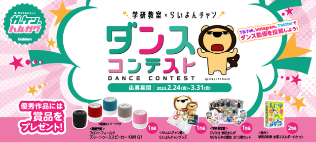 本日より、子どもたちにも人気を誇る「らいよんチャン」と「学研教室」のコラボダンスコンテストがスタートしました。本ダンスコンテストは、オリジナルソングに合わせて踊っていただいた動画を投稿するだけで、どなたでも楽しく参加できます。「らいよんチャン」と「学研教室」がコラボレーションした動画の中で、軽快に踊るらいよんチャンを参考に、ぜひ家族やお友だちを誘ってみなさんでご参加ください。