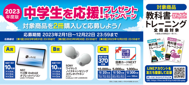 『中学教科書ぴったりトレーニング』を2冊購入(全教科対象)し、LINE公式アカウント「新興出版社for中学生」に友だち登録することで中学生に人気のタブレットやワイヤレスイヤホン、図書カードが当たるプレゼントキャンペーンにご応募できます。