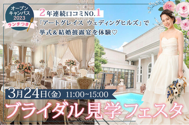 京都ホテル観光ブライダル専門学校は、2023年3月24日(金)にオープンキャンパス「ブライダル見学フェスタ」を開催します。今回は、株式会社ベストブライダルが運営する「アートグレイス ウエディングヒルズ」で行う学外イベントです。参加者のみなさまには模擬披露宴に参加していただき、結婚式やブライダル業界の魅力について知っていただく機会を提供いたします。