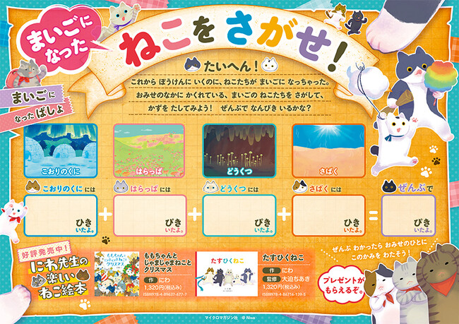 マイクロマガジン社(東京都中央区)は、大人気さんすう絵本『たすひくねこ』の書店イベント「まいごになったねこをさがせ!」を、3月1日(水)より順次開催いたします。