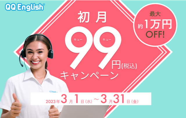 株式会社QQEnglish (本社:東京都渋谷区、代表取締役:藤岡 頼光)は、提供するオンライン英会話サービス「QQEnglish」「QQキッズ」にて、2023年3月1日より「新規入会 全プラン初月99円キャンペーン」を実施することをお知らせいたします。