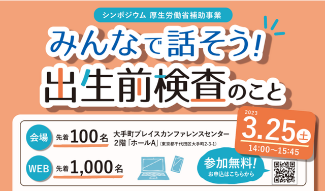 【日 時】 2023年3月25日(土) 14:00~15:45【会 場】 大手町プレイスカンファレンスセンター 「ホールA」(東京都千代田区大手町2-3-1 2階)【テーマ】 みんなで話そう!出生前検査のこと