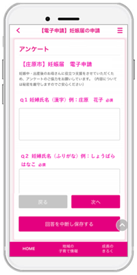 今回、庄原市が提供を開始する「質問票サービス」は、母子健康手帳交付時等のアンケートをオンラインで入力、提出できるサービスです。『母子モ』の申請ページから、アンケートが時間や場所を問わずに入力、提出できるようになります。