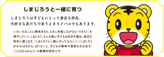 小学校就学前の幼児教育を目的とした通信講座に加え、子育て情報の提供、幼児向け教育番組の放送や配信、映画、コンサート等を提供しています。その「こどもちゃれんじ」から生まれたキャラクター“しまじろう”は、子どもの認知度が90%以上、子育てをしている親世代の認知度が99% (共にベネッセ調べ※)と、高い認知と人気がある、「こどもちゃれんじ」の象徴的存在です。