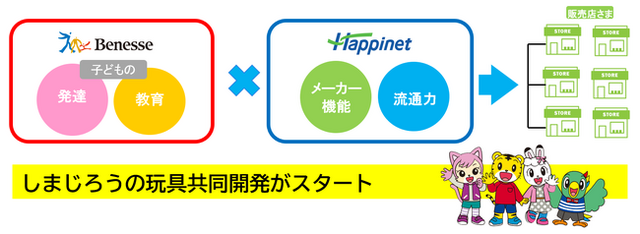 今回、子供の発達と教育に深い知見を持つベネッセと、玩具企画・開発のノウハウと流通力を合わせ持つハピネット両社の強みを活かした「おもちゃ」をもっとたくさんの子どもたちに楽しみながら体験して欲しい、という両社の思いが合致し、「しまじろうの玩具」を発売することになりました。