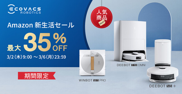 ロボットの研究開発、生産、販売を一体化した家庭用ロボットの総合メーカー・エコバックスジャパン株式会社(東京都品川区/代表取締役社長 坂梨文康)は、3月2日(木)9:00から3月6日(月)23:59までAmazon.co.jpで開催される「新生活セール」に参加、人気製品が最大35%OFFとなる特別セールを実施いたします。