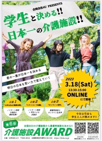 「イノベーション。誰かのために社会を面白くする!」をミッションに日本全国の介護施設の見学など行う合同会社4U≪フォーユー≫(本社:兵庫県西宮市、代表:蛯沢渉)は、全国800の介護施設からセレクションされた業界に価値のある施設を表彰する祭典「第6回介護施設アワード2022」を2023年3月18日(土)13時30分からオンラインイベントにて開催することをお知らせします。