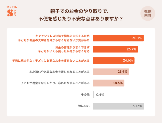 実際に親子でお金のやりとりを行う際の課題感について聞いたところ、「キャッシュレス利用で簡単に支払えるため、子どもがお金の大切さを分からなくならないか(30.1%)」がもっとも多い回答となりました。続いて、「お金の管理がうまくできず、いくら使ったか分からない(26.7%)」「手元に現金がなくて、親が子どもに必要なお金を渡せない(26.7%)」が上位となり、キャッシュレス利用による、お金の大切さに対する意識の薄れや日々のお金の管理に課題を感じるていることがわかりました。