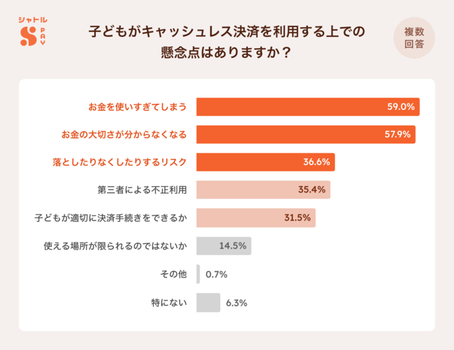 子どもがキャッシュレス決済を利用する上での懸念点上位は、「お金を使いすぎてしまう」「お金の大切さが分からなくなる」「落としたりなくしたりするリスク」