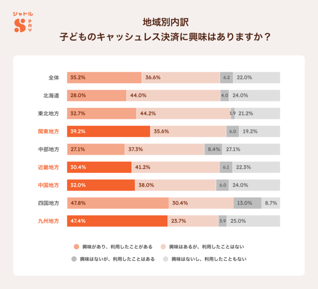 地域別に見ると、子どものキャッシュレス利用について「興味があり、利用したことがある」と答えた人は、関東地方39.2%に対し、近畿地方30.4%との結果となり、関東地方のほうが近畿地方より子どものキャッシュレス利用が進んでいる現状が伺えました。また、九州地方が47.4%と非常に高い一方、中部地方は27.1%と低く、地域差が大きいこともわかりました。【図8】