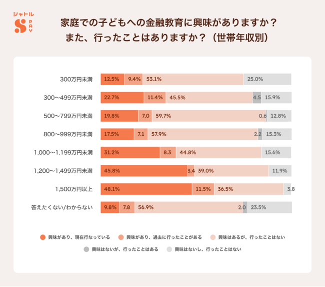 また世帯年収別に見ると、金融教育に対する興味は全年収層で高いものの、世帯年収1,200万円以上の世帯が「興味があり、現在行っている」と答えた人が約5割と多く、高年収層で、実施率が高く、行動に差が生じている現状が浮き彫りになりました。【図3】