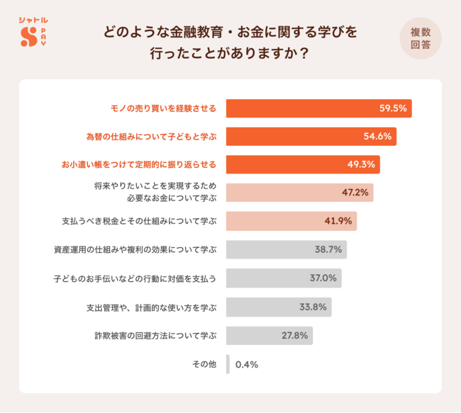 また、実際に行ったことのある金融教育については、「モノの売り買いを経験させる(59.5%)」「為替の仕組みについて子どもと学ぶ(54.6%)」「お小遣い帳をつけて定期的に振り返らせる(49.3%)」が上位となりました。この結果からも、「モノの売り買い」や「お小遣い帳をつける」といった経験は、家庭で金融教育を始めるにあたり、取っ掛かりとなりやすい経験であることがわかりました。【図5】