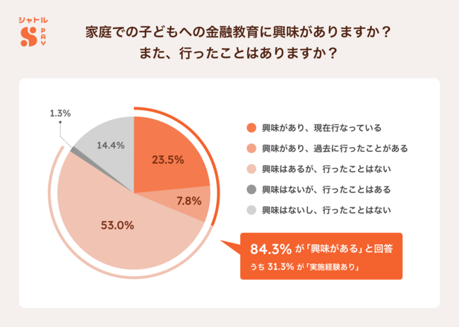 家庭での子どもへの金融教育について、約5割が「興味はあるが、行ったことはない」と回答。一方、「興味があり行っている/行ったことがある」人は約3割となり、合わせて8割以上が興味あり