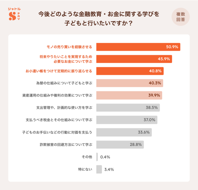 続いて、具体的にどのような内容の金融教育に興味があるか聞きました。結果、「モノの売り買いを経験させる(50.9%)」「将来やりたいことを実現するために必要なお金について学ぶ(45.9%)」「お小遣い帳をつけて定期的に振り返らせる(40.8%)」が回答上位となりました。さらに「為替の仕組みについて子どもと学ぶ(40.3%)」「資産運用の仕組みや複利の効果について学ぶ(39.9%)」と続き、小学校高学年~中学生の親が子どもに対して、資産運用や為替の仕組みも含む、しっかりとした金融知識を身につけて欲しいと考えていることが伺えました。【図4】