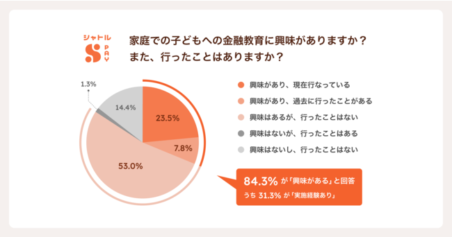 家庭での金融教育については、84.3%が「興味がある」と回答。実際に金融教育を行っている/行ったことがある人は全体の31.3%で「興味はあるが、行ったことはない」人がもっとも多く、53.0%との結果に。金融教育については、関心は高いものの、投資経験のある親でも行動に移せていない人が多い実情が伺えました。【図2】