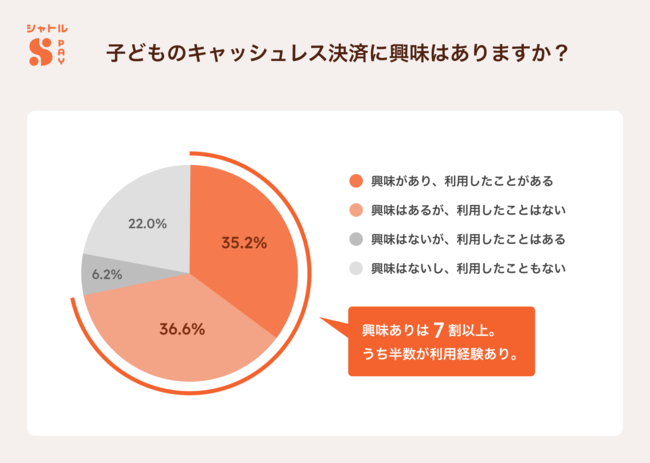 さらに、子どものキャッシュレス決済利用への関心についても聞きました。「子どものキャッシュレス決済に興味がある」と回答した人は71.8%にのぼり、回答者の7割以上の人がキャッシュレス決済を子どもが使うことに、前向きであることがわかりました。また、35.2% がすでに利用経験ありと回答しており、キャッシュレス決済が若年層にも徐々に普及しつつある現状が伺えました。【図7】
