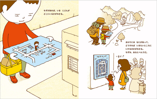 シリーズ第5作目となる本書のテーマは「地図」。主人公のゆうくんは、お母さんの描いた地図を頼りにおつかいにでかけます。地図は自分が今いる場所を把握できたり、目的地までの道順を示してくれます。情報を絵にして分かりやすくしたものが「地図」だとしたら、何かの仕組みや考え方の地図もあるかもしれない……と想像をふくらませていきます。